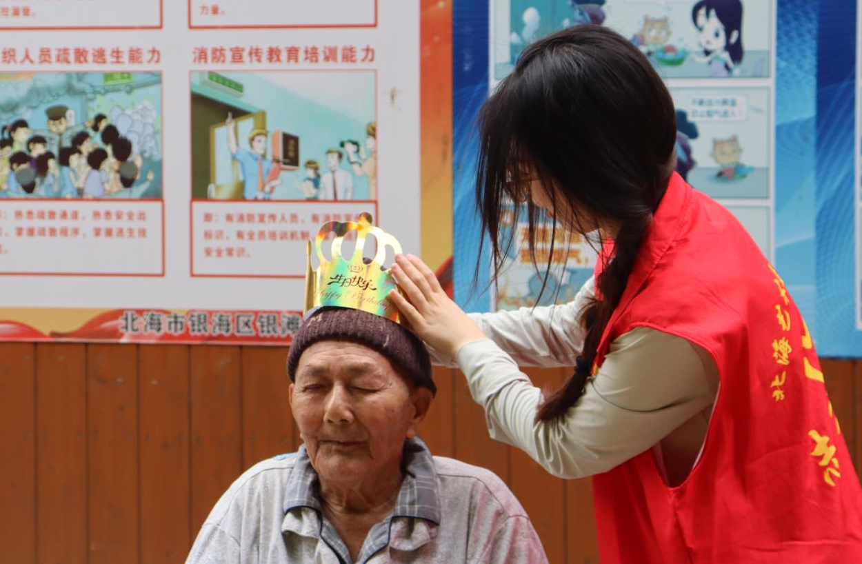 志愿者为老人戴生日帽