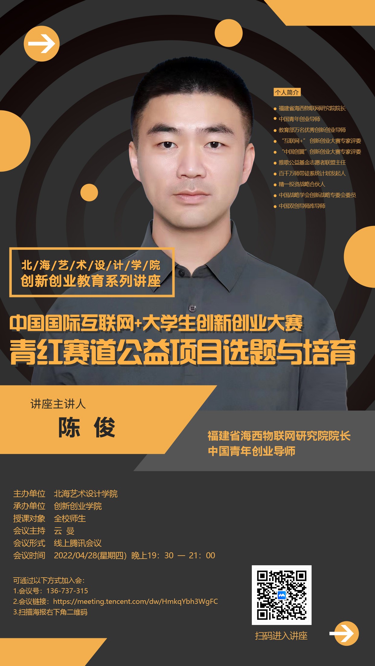 讲座名称:《中国国际互联网+大学生创新创业大赛 青红赛道公益项目选题与培育》
