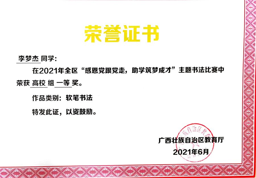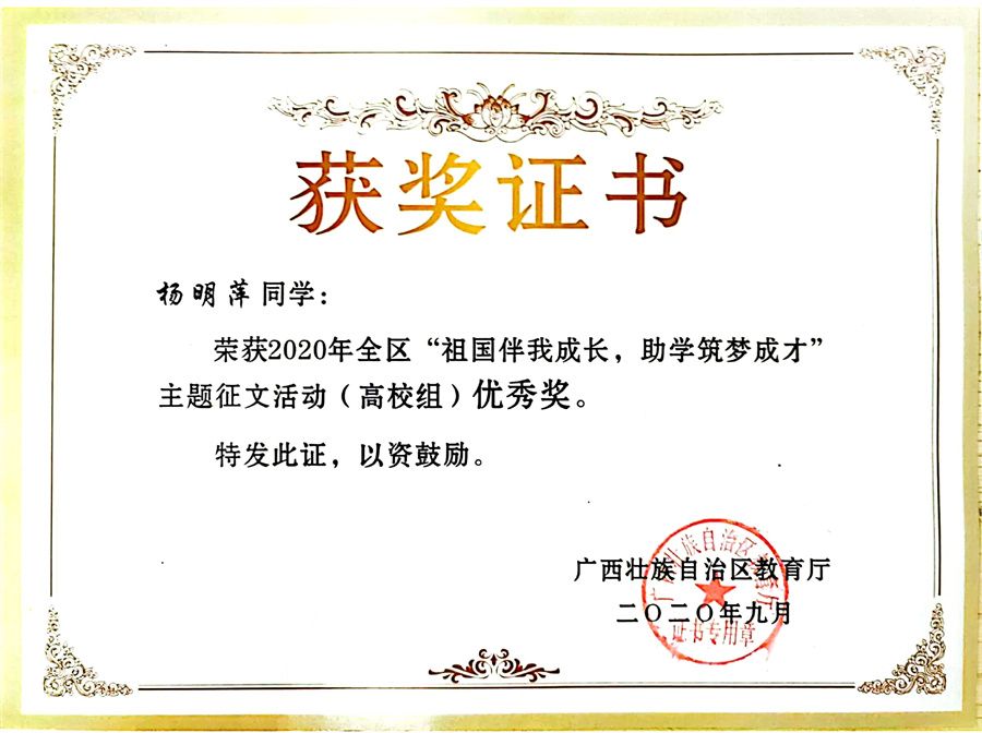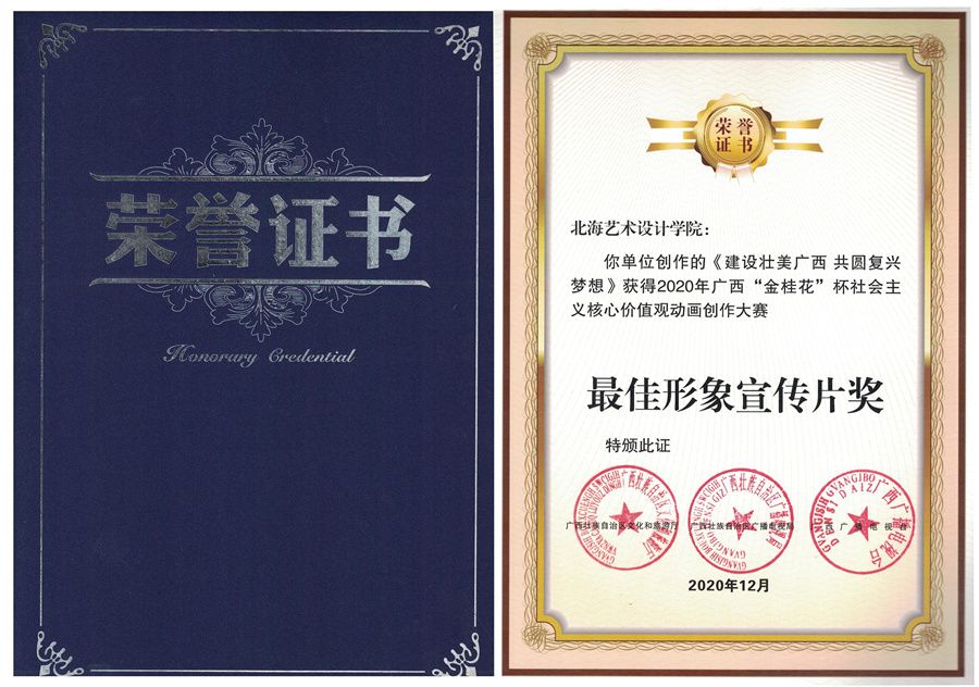 学校拍摄的《建设壮美广西,共圆复兴梦想》最佳形象宣传片奖证书