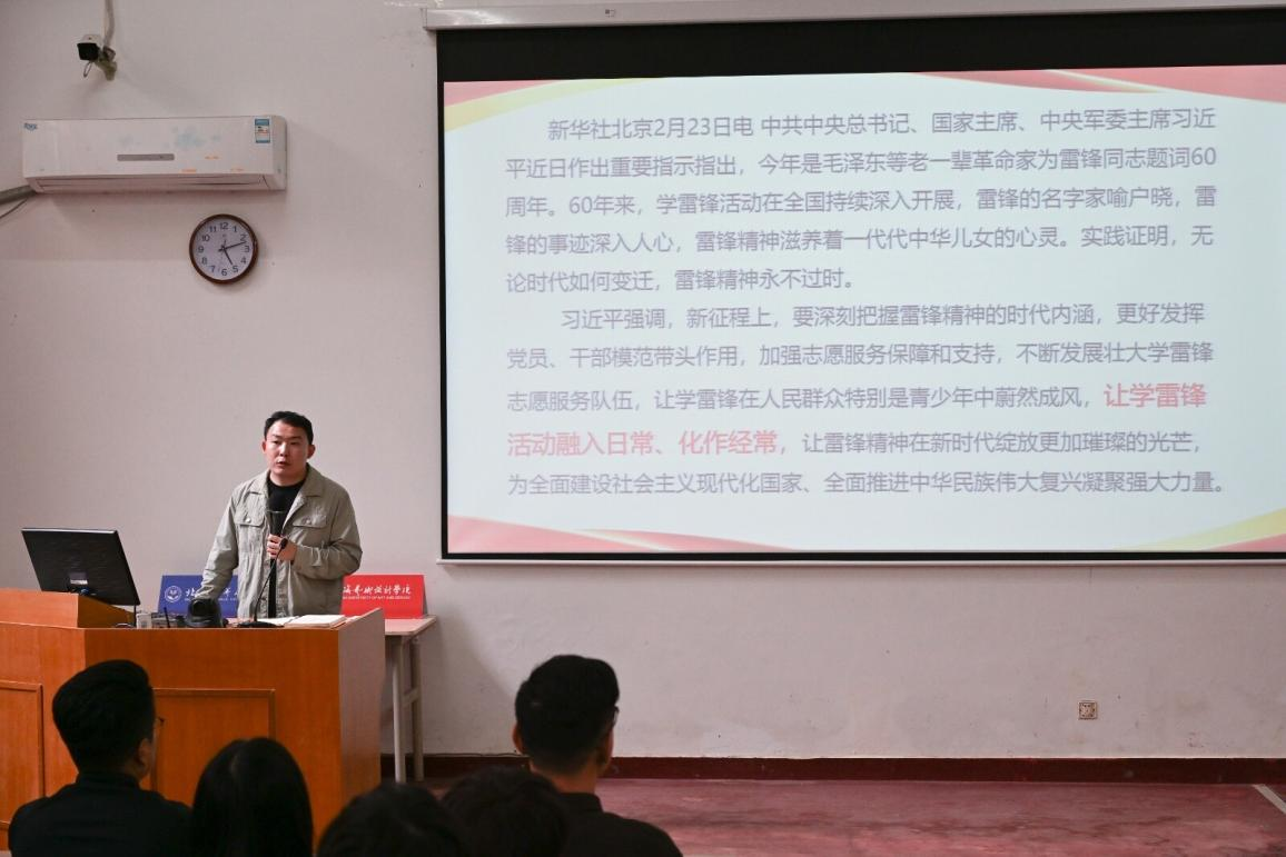 启动仪式上,影视动画学院党总支副书记巴瑞斌开展专题党课,深入解读雷锋精神核心内涵、回顾学习雷锋纪念日的历史渊源,并传达习近平总书记对深入开展学雷锋活动的重要指示精神,强调雷锋精神在新时代仍具有重要引领作用。