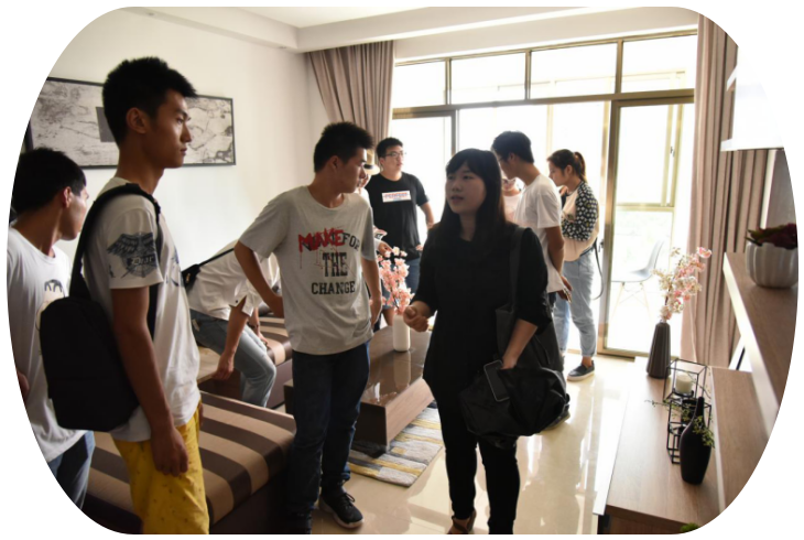 随后,我院师生受邀到精装修的样板房中参观学习。在参观的过程中,我院教师结合家居设计文化,详细地讲解了家居布局、家具配色、摄温运用、空间功能以及建筑装饰材料性能等。学生在参观过程中,对室内装修设计、家居设计方面提出问题,教师现场教学讲解,加深了学生对专业理论知识的理解。在参观交流的过程中,同学们也深刻地感受到装饰设计精致化以及注重客户文化体验的重要性。