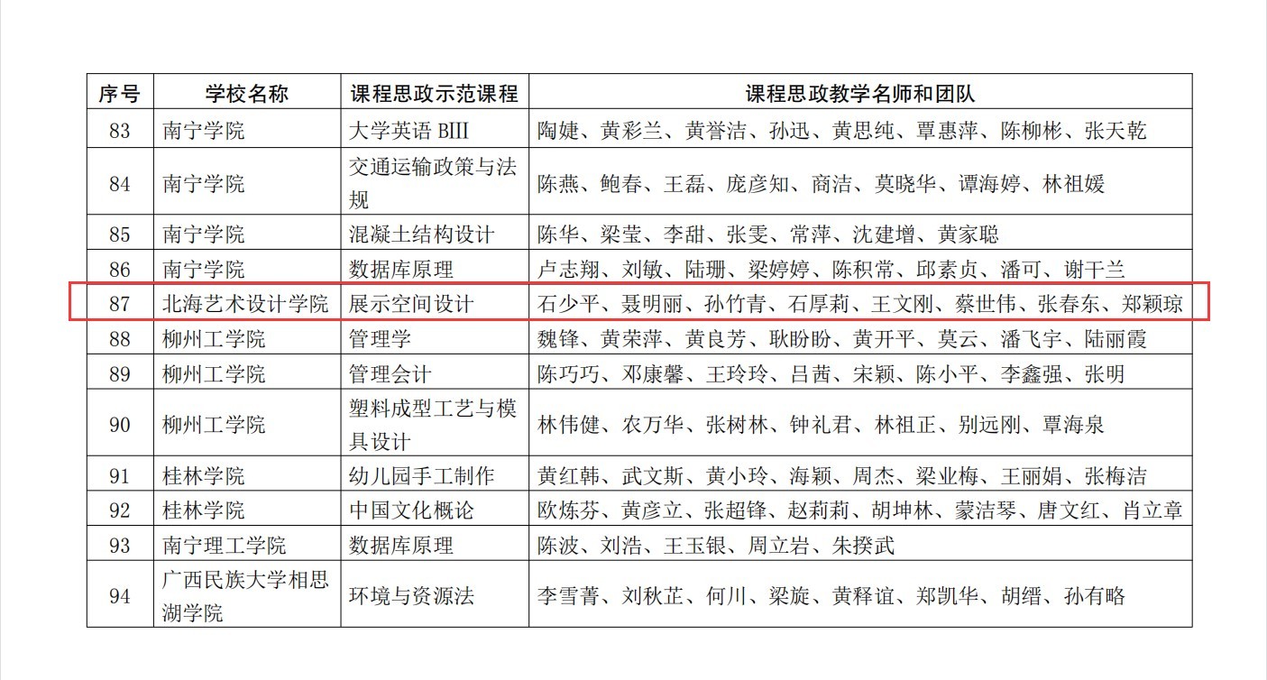 近日,自治区教育厅公布了2023年全区高校课程思政示范课程和课程思政示范基层教学组织名单。学校建筑与环境艺术学院的《展示空间设计》课程被认定为2023年自治区级课程思政示范课程。石少平、聂明丽、孙竹青、石厚莉、王文刚、蔡世伟、张春东、郑颖琼老师获得“课程思政教学名师和团队”称号。