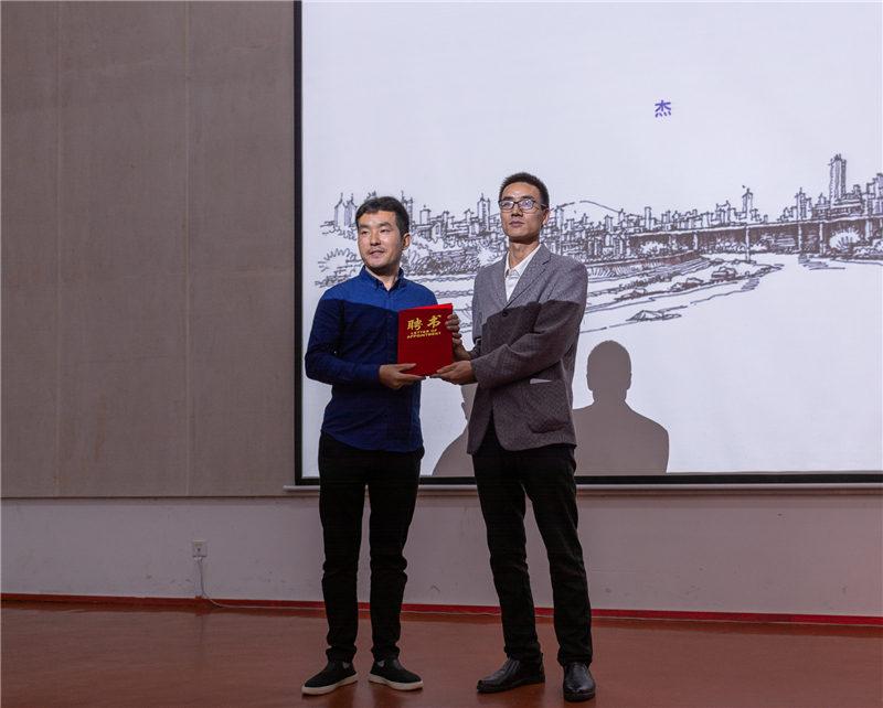 讲座开始前,我校环境艺术设计学院副院长王文刚为刘杰先生颁发聘请证书,正式聘请其为我校教授。
