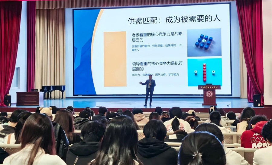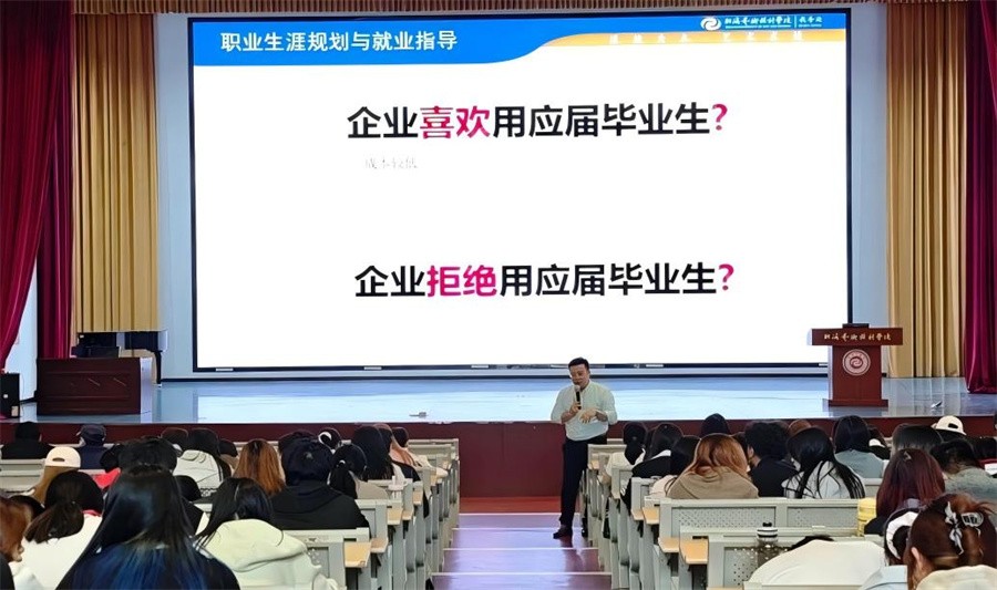 课堂上,校领导结合当前就业形势与学校就业工作整体部署,在分析全国及区域就业政策、行业发展趋势的基础上,特别强调“德为业之本”的职业发展理念。针对毕业生即将步入职场的实际需求,从宏观层面解读了新时代职场对从业者道德素养的核心要求:既引导大家将个人职业规划与国家发展需求相结合,树立“到基层建功、以实干立身”的职业追求,也着重强调诚信求职的重要性,提醒学子杜绝简历造假、违约失信等行为,将“诚信为本”的道德准则融入求职全过程。同时,围绕“职场沟通礼仪”“面试举止规范”等实用内容,校领导以亲身经历为例,讲解职场中文明用语、尊重他人、团队协作等礼仪细节的重要性,指出良好的文明素养既是职业形象的“加分项”,更是长远发展的“奠基石”,鼓励学子在提升专业能力的同时,主动涵养文明习惯、锤炼道德品格。