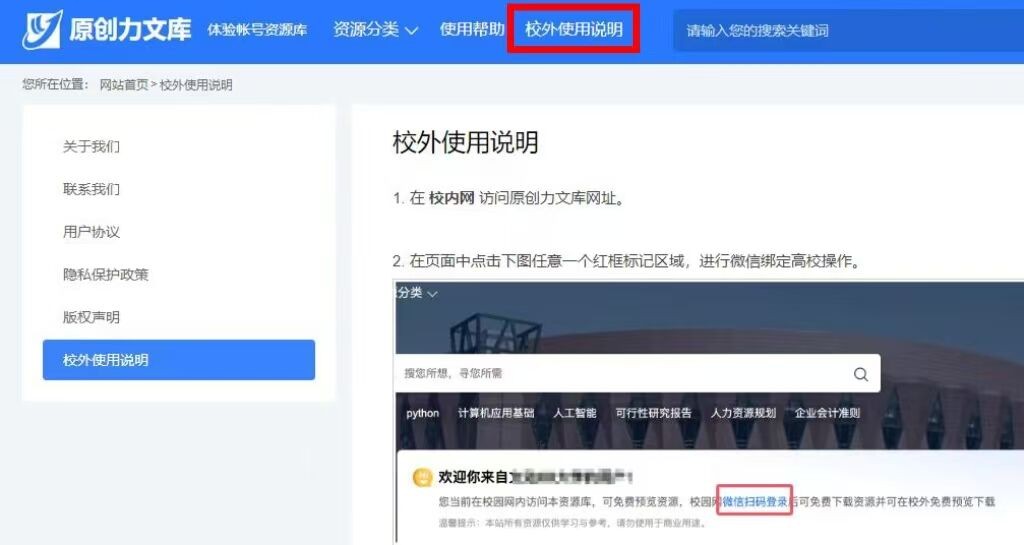 非校园网ip下使用网站时,需微信扫码登录后方可使用。如已在校内有效IP地址绑定过高校信息,微信扫码成功后即可访问资源库,图如下图如示: