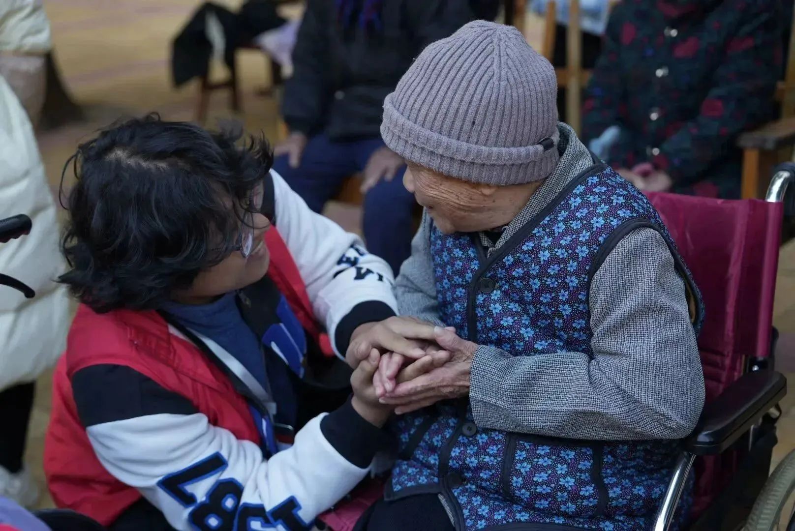 (志愿者为老人暖手)