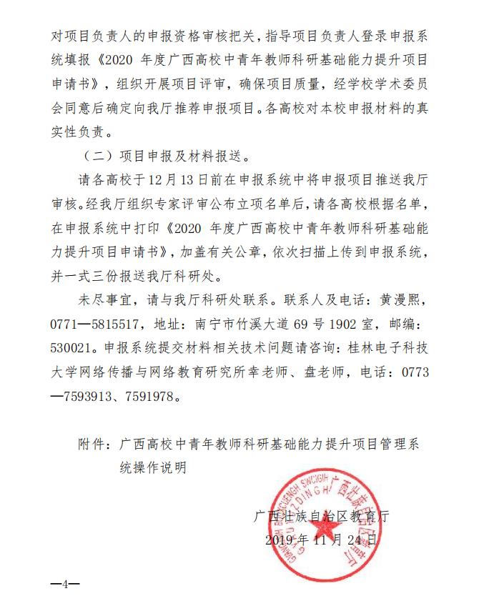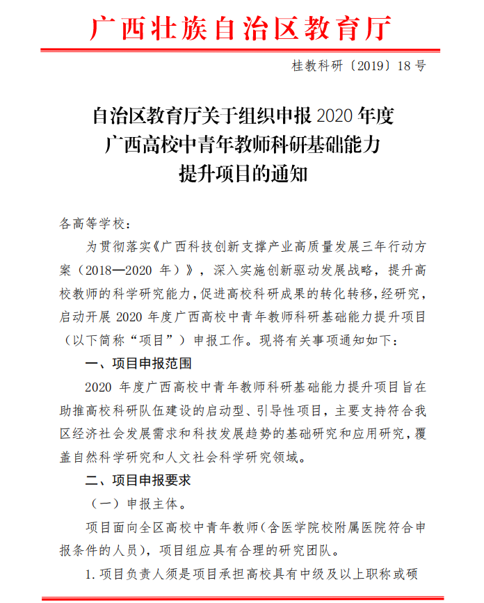 自治区教育厅关于组织申报2020年度广西高校中青年教师科研基础能力提升项目的通知