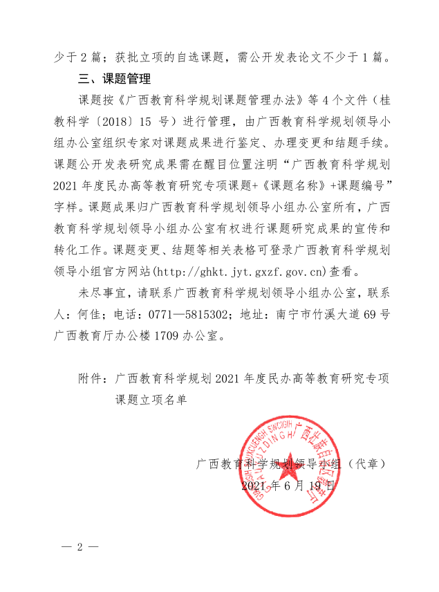 附件1:广西教育科学规划领导小组关于公布广西教育科学规划2021年度民办高等教育研究专项课题立项名单