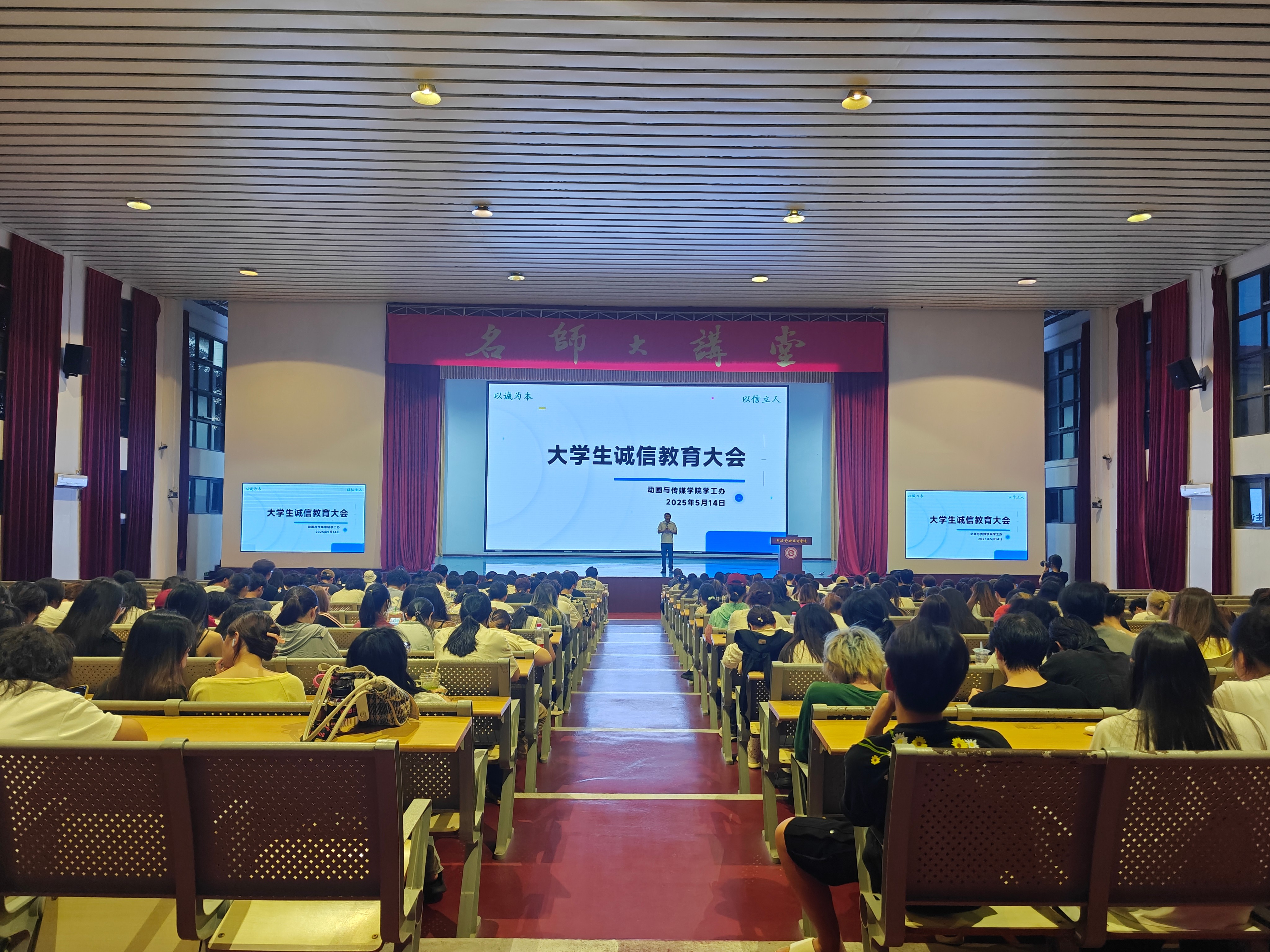 为进一步加大学生资助政策宣传力度,全面展示资助政策落实成效,加强对受奖助学生励志感恩教育,确保国家学生资助政策家喻户晓、深入人心,2025年5月14日,动画与传媒学院学工办在大礼堂召开了“学生资助伴你成长,教育强国奋斗有我”诚信教育大会。动画与传媒学院党总支副书记巴瑞斌、学院学生资助工作负责人梁彩媚、林芊芊和500余名获得学生资助政策帮助的学生参加会议,共同学习诚信理念,践行感恩精神。