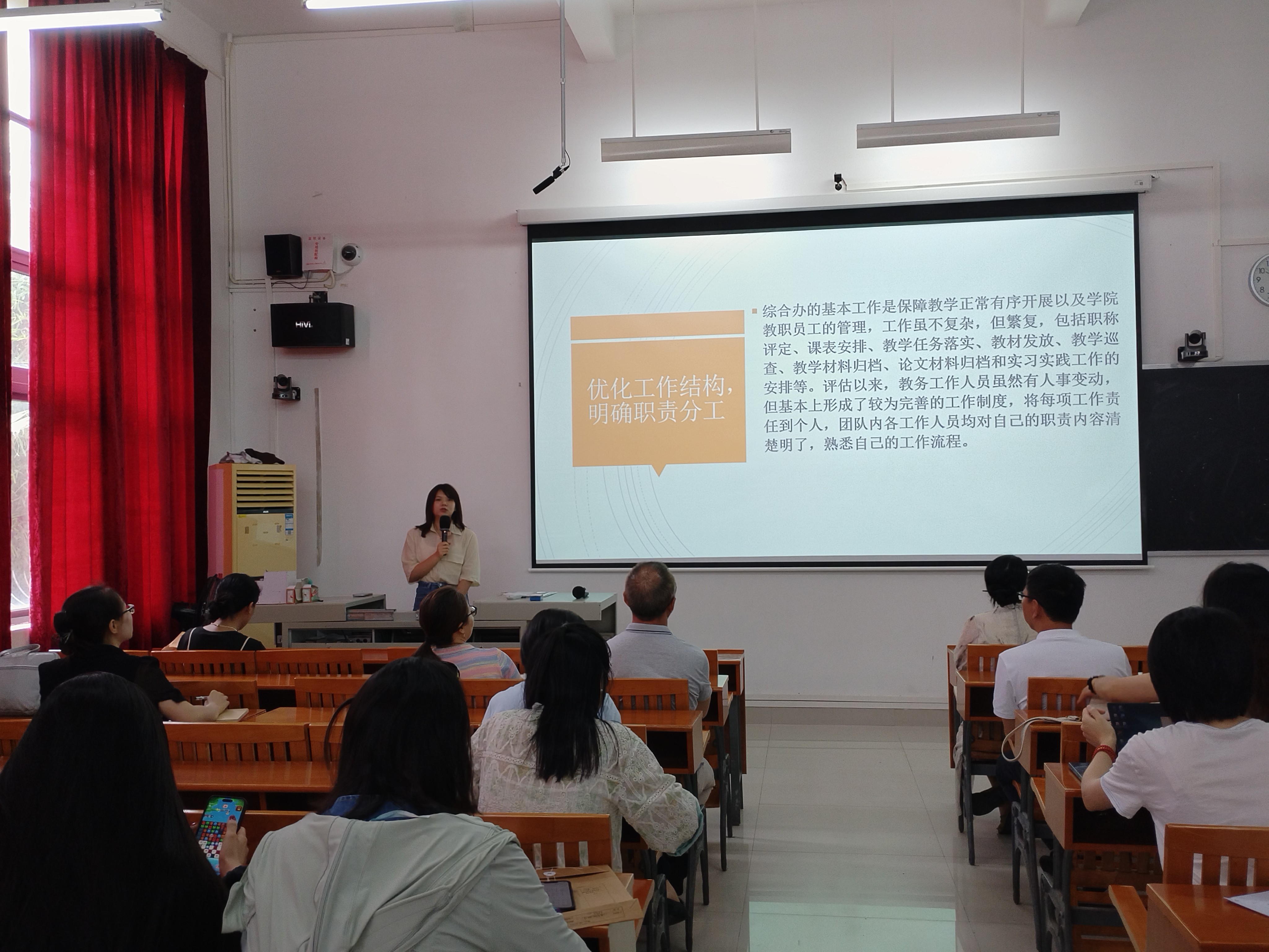 教务处副处长曾之光对各教研室辛勤付出所取得的教学成果表示了肯定,并强调,各教研室应该在后续教学工作和材料归档工作中严格按照教学质量评估要求与标准执行,更加明确人才培养的方向和目标,同时也欢迎各位老师对教务工作的不足进行指正,共同推进和完善各项管理制度。