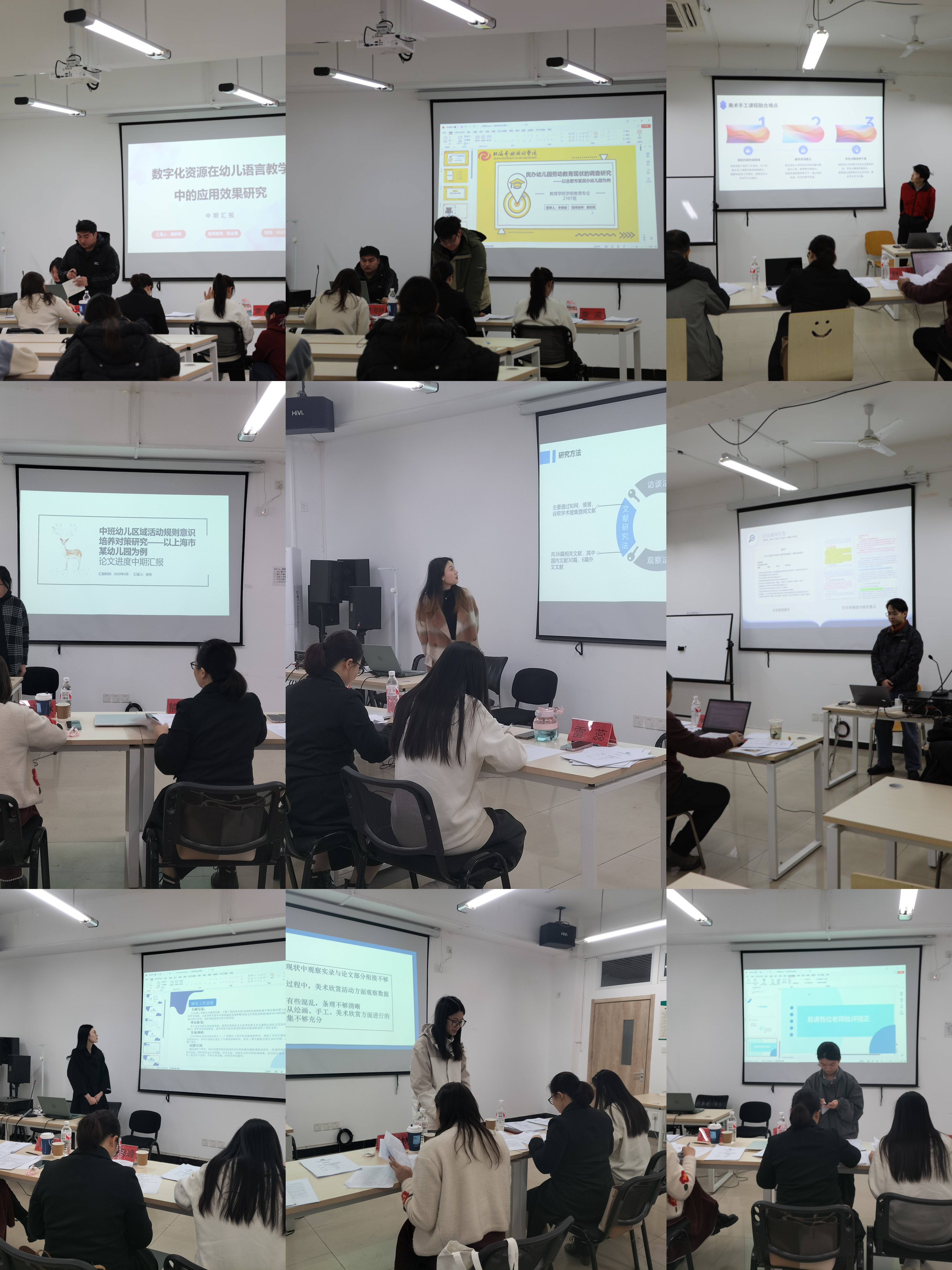 中期答辩现场,艺术教育专业和学前教育专业每一位学生,分别从目前的研究进展、已完成情况、遇到的问题以及下一步的计划等方面进行汇报。他们的研究内容密切联系专业实践,深究行业中遇到的各类教育方法创新、课程设计优化、教师教育活动指导能力提升等多个领域,展现出学生们对专业领域的深入关注和积极的探索精神。