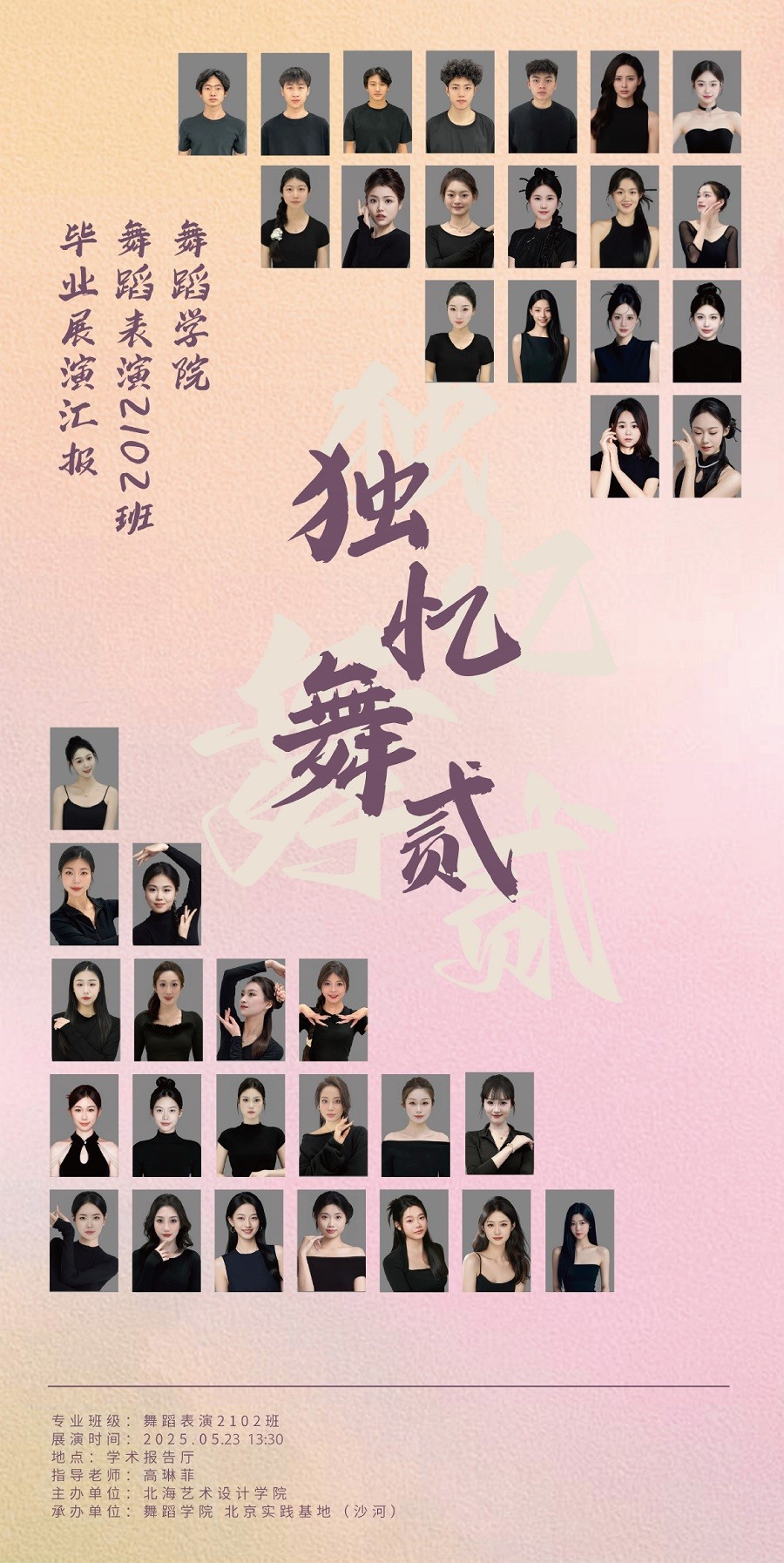 2025年5月23日-5月24日,北海艺术设计学院舞蹈学院舞蹈表演专业2025届毕业生将以最动人的舞姿,上交他们的大学本科四年的青春答卷。本次毕业展演共五场,涵盖古典舞、民族舞、现代舞等多元风格,既有传统的深厚底蕴,又有创新的时代表达,展现学生四年专业学习的成长与蜕变。