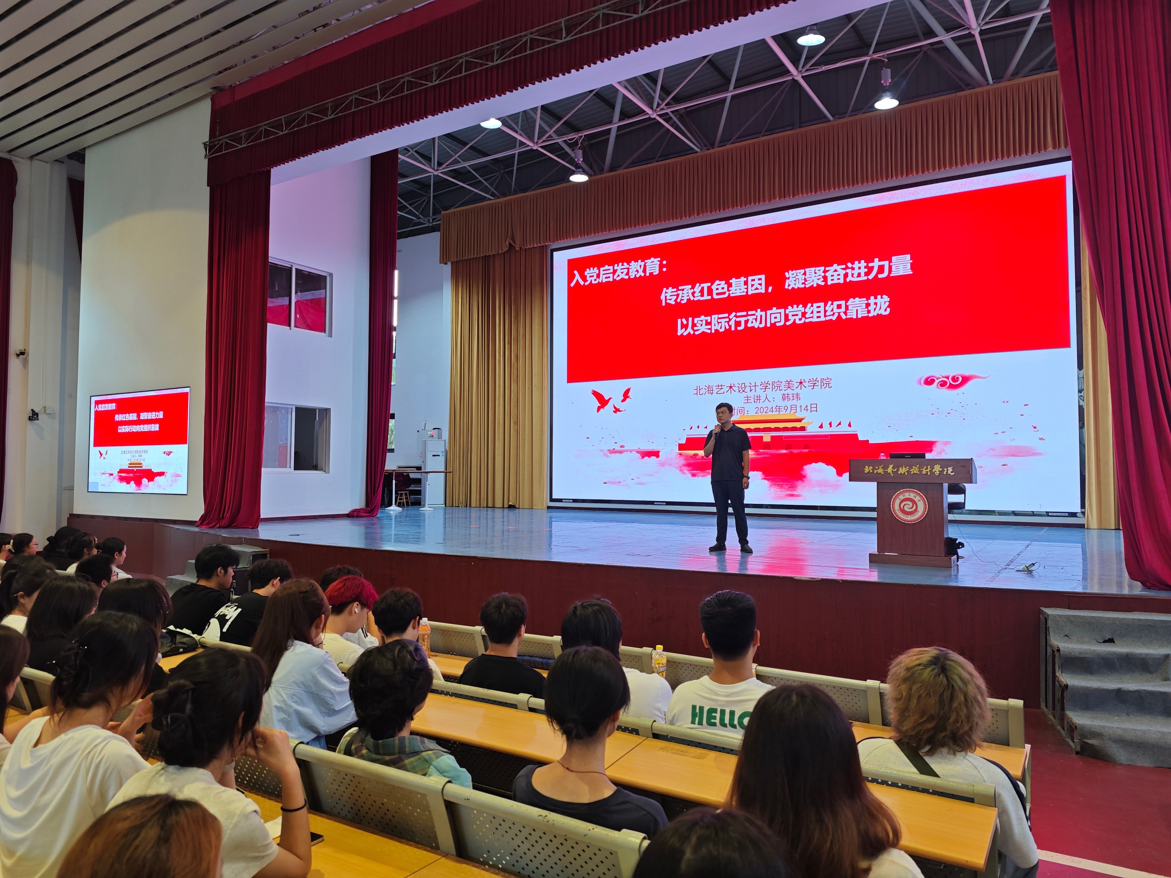 2024年9月14日下午15时,为深入学习贯彻习近平新时代中国特色社会主义思想,全面落实新时代党的建设总要求和新时代党的组织路线,美术学院党总支书记韩玮同志在学校大礼堂为美术学院2024级新生开展了一次意义深远的入党启发教育。