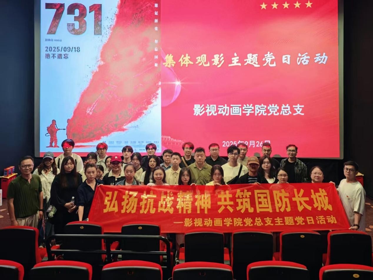 为深入学习领会习近平总书记在纪念中国人民抗日战争暨世界反法西斯战争胜利80周年大会上的重要讲话精神,在我国第25个全民国防教育日期间,2025年9月26日,影视动画学院党总支开展“弘扬抗战精神,共筑国防长城”主题党日活动,本次活动共组织学院党员师生35人参加集体观影。