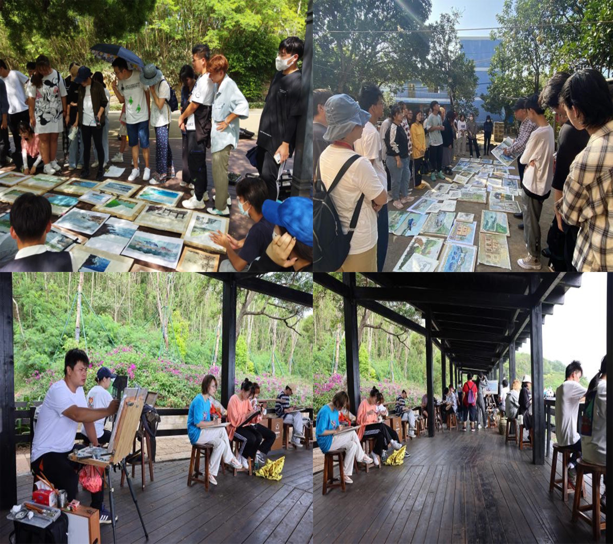 师生们每到一地,认真地根据现场环境进行写生创作,相互观摩画作,交流作画心得,老师们对同学们的作品一一进行讲解,对同学们出现的疑惑、问题进行解答,并传授给同学们在画工上的经验、技法。