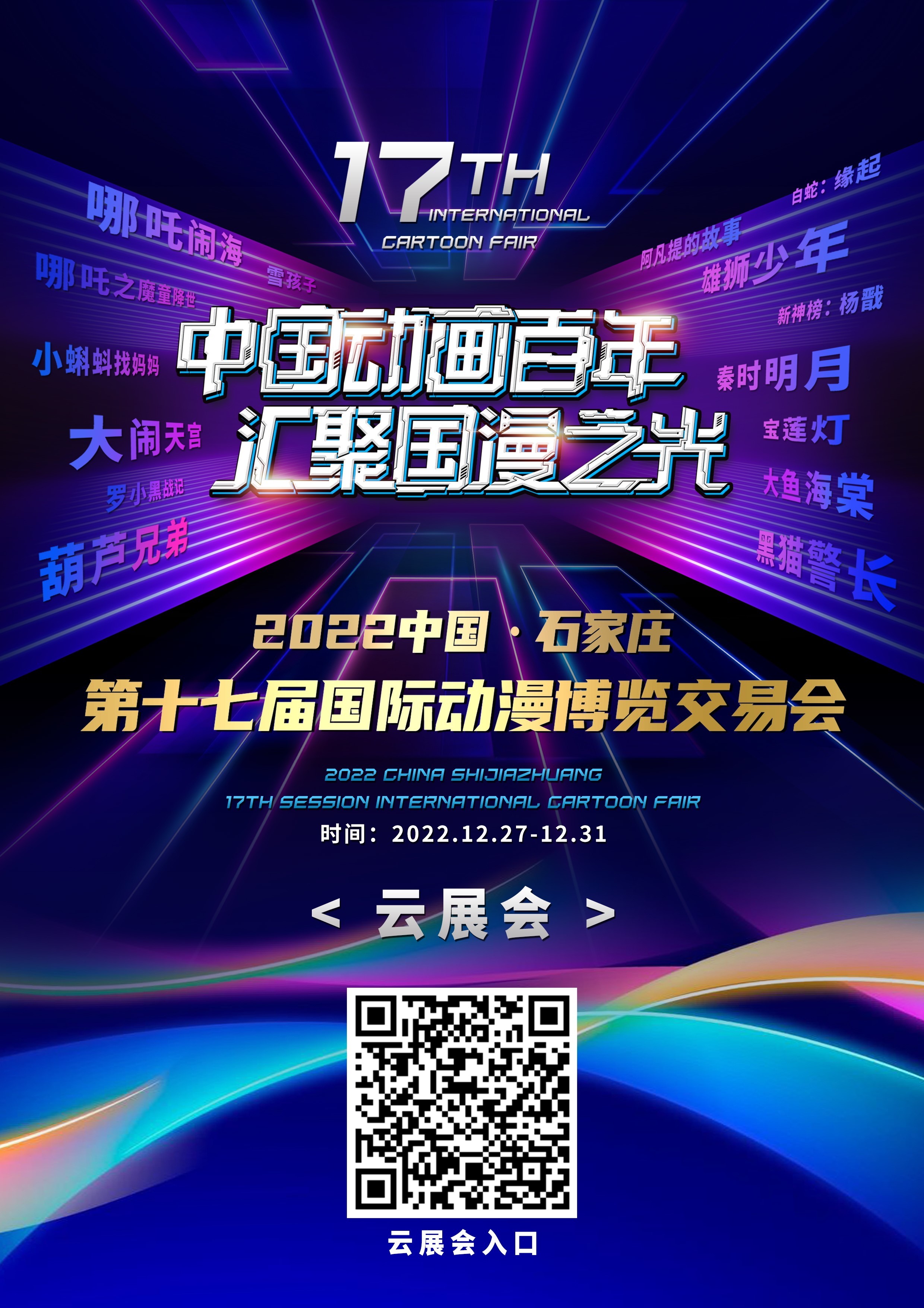2022中国·石家庄第十七届国际动漫博览交易会云展会于12月27日-31日隆重举办。本届动博会以“中国动画百年 汇聚国漫之光”为主题,由中共石家庄市委、石家庄市人民政府、石家庄市动漫产业发展领导小组主办,精英集团影业发展有限公司承办,中国动画产业网、石家庄市文化产业协会、石家庄市动漫协会协办。