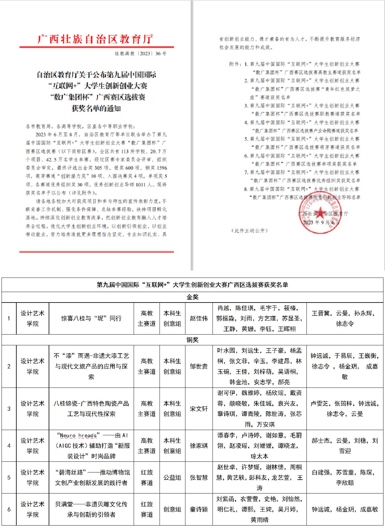 近日,广西壮族自治区教育厅发文公布了第九届中国国际“互联网+”大学生创新创业大赛“数广集团杯”广西赛区选拔赛获奖名单,我院斩获奖项6项,其中,项目《惊喜八桂与“坭”同行》斩获自治区级金奖,其它晋级区赛的5个项目荣获自治区级铜奖。据悉,本届大赛广西赛区选拔赛共有113所院校、近20.7万个项目报名参赛。其中66所院校516个项目入围区赛现场总决赛。