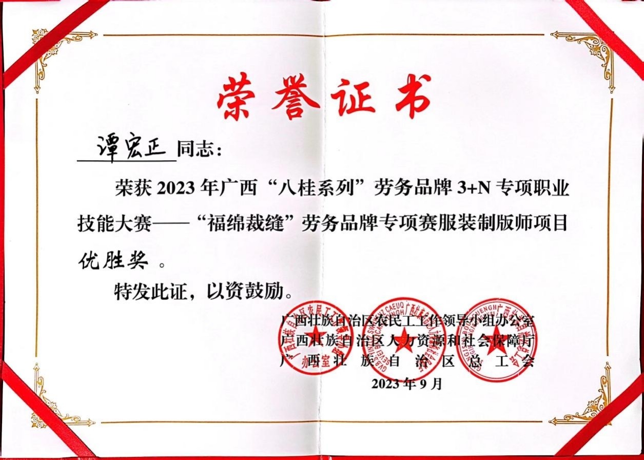 经过选手们激烈的角逐,裁判组严格认真的评审,我校教师谭宏正获得服装制版师优胜奖,学生谭春李获得缝纫工优胜奖。