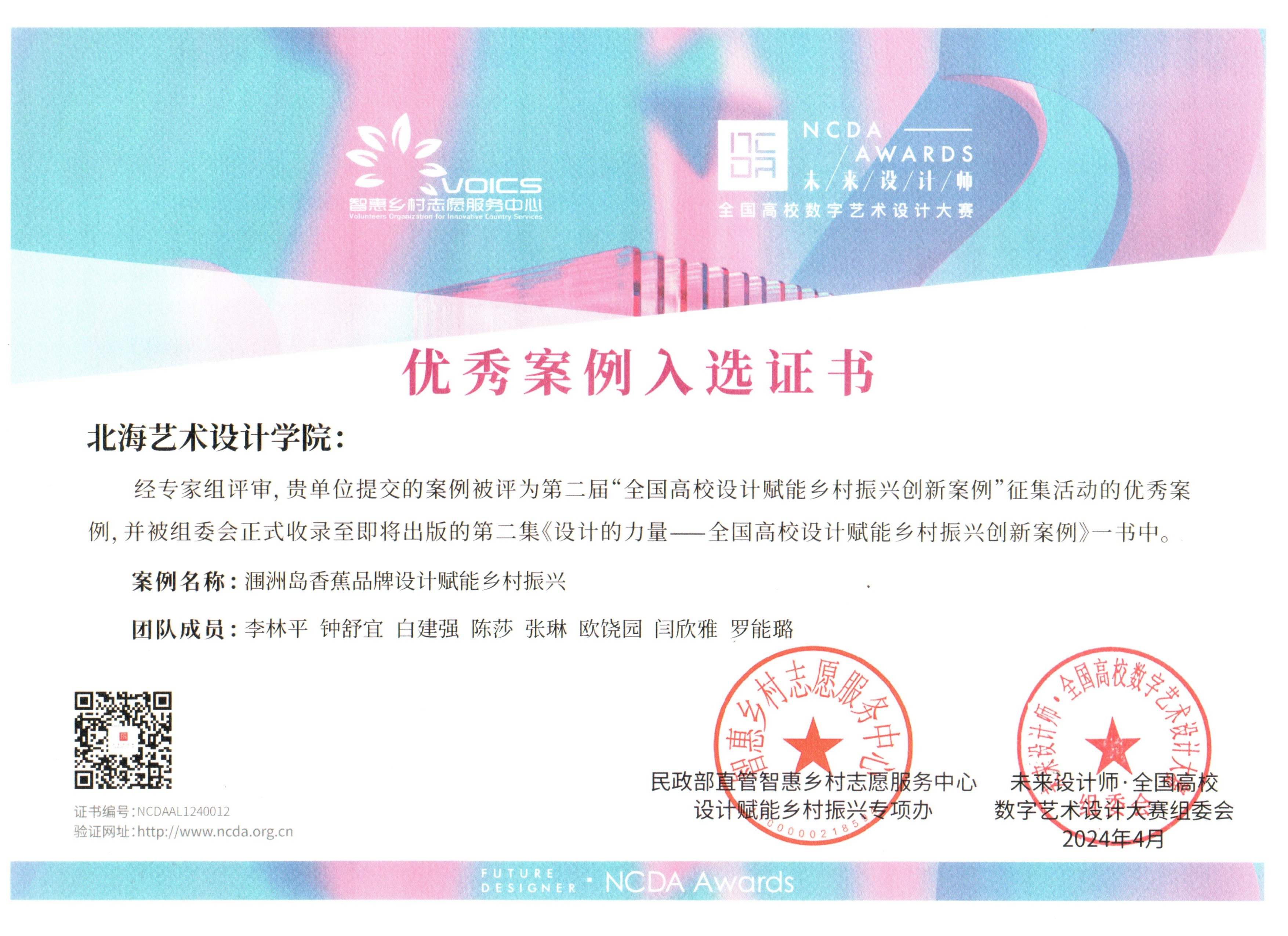 设计赋能乡村振兴创新教育学术活动是本届“高博会”的重要组成部分,活动以“赋能乡村振兴 共富美丽中国”为主题,聚焦乡村文化、教育创新、人才培养、赛教融合等热点话题,来自全国各地的专家、学者围绕设计赋能乡村振兴相关领域的知识前沿与创新实践,进行了全方位、多维度、深层次的交流。同步举办了未来设计师大赛组委会与民政部直管智惠乡村志愿服务中心共同发起的“我为乡村做设计”表彰活动,我院李林平、钟舒宜、白建强、陈莎等老师指导,学生张琳、欧饶、闫欣雅、罗能璐等完成的“涠洲岛香蕉品牌设计赋能乡村振兴”设计案例成功入选2023年第二届“全国高校设计赋能乡村振兴创新案例”。学校荣获“全国高校设计赋能乡村振兴志愿服务先进单位”。