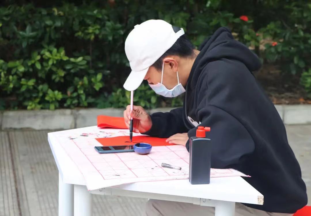 本次活动是由招募的志愿者人员进行现场书写春联,在寒风凛冽中每位志愿者紧握手中灼热的笔杆书写出对美好未来的憧憬与期盼。