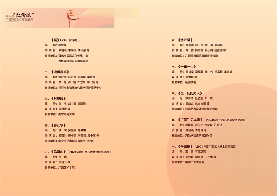 据悉,“红绣球”广西舞蹈创作作品展演旨在为全区舞蹈艺术工作者建高水准的竞技、展示平台,以赛促学、以赛育人,加大对广西舞蹈人才的培养力度,挖掘广西本土优秀舞蹈原创作品,推动舞蹈人才培育。此次展演活动经广西舞蹈家协会组织推选委员会进行初评,从全区申报的26个作品中推选了10个作品入围现场展演终评。