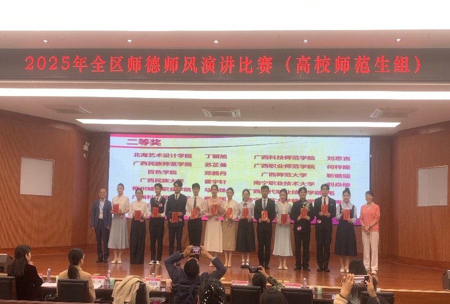11月8日至9日,由广西壮族自治区教育厅主办的以“铸魂强师,共绘教育蓝图”为主题的2025年全区师德师风演讲比赛在广西师范大学育才校区成功举行。教育学院学前教育专业两名学生参赛,经过激烈角逐,丁朝旭同学凭借出色表现荣获高校师范生组二等奖。