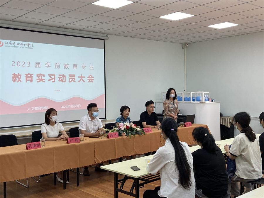 2022年8月23日上午,我校人文教育学院2023届学前教育专业实习动员大会在北京京师教育集团甜水园召开。京师教育集团总园园长吴豫安,我校副校长邱杰、北京实践基地办公室副主任严腾、班主任孔德相、实习带队老师丁振鹏等出席动员大会。大会由丁振鹏老师主持。